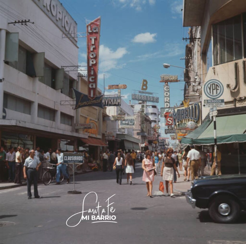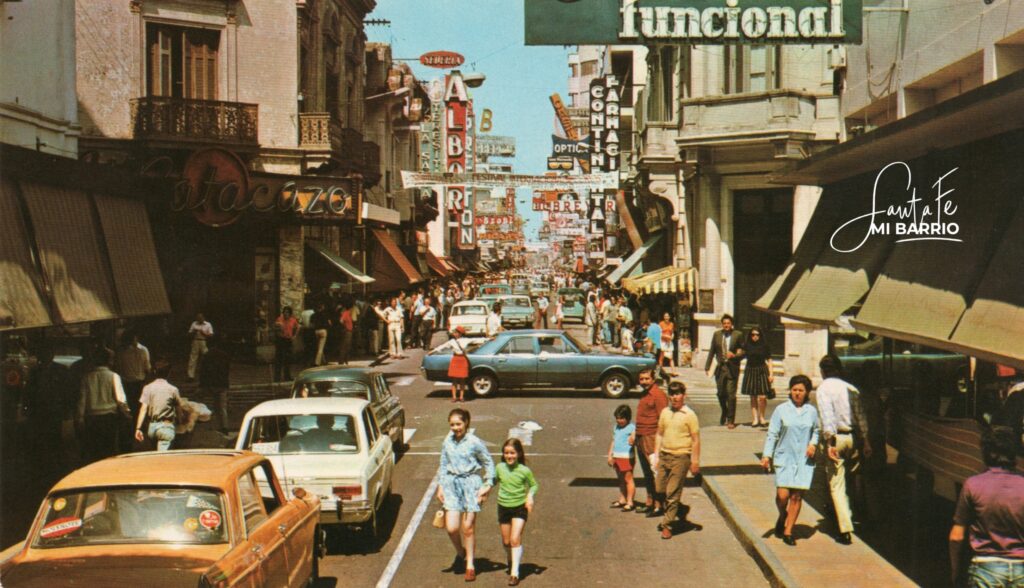 De regreso a las discusiones sobre la veda al tránsito en San Martín, vale decir que se prolongaron por muchos años. En 1970 todavía se discutía la medida por parte de muchos comerciantes que solicitaban el ingreso de los vehículos a la arteria, que en ese momento era solo de 9:30 a 12:30 y de 17 a 23, ya que después de las 20 “…la principal arteria santafesina presenta un aspecto desolador…”, decía un comerciante ante la falta de peatones y de autos. (El Litoral 20/1/1970). Vale decir que la fisonomía era de la calle con sus veredas y cordones pero sin paso de vehículos. Ya para 1973 el tránsito solo circulaba hacia el norte, en una única mano, que los sábados a la noche, fuera del horario de restricción, hacía de San Martín un paseo obligado en auto, para retomar el circuito hacia el sur por San Jerónimo, ya sin las largas filas a paso de hombre que presentaba la antigua Calle Comercio, aquello que algunos bautizaron como “la vuelta al perro”. Y las “galerías”, paseos de comercios hacia el interior de las manzanas, incluso algunas con salidas por calles paralelas o transversales.