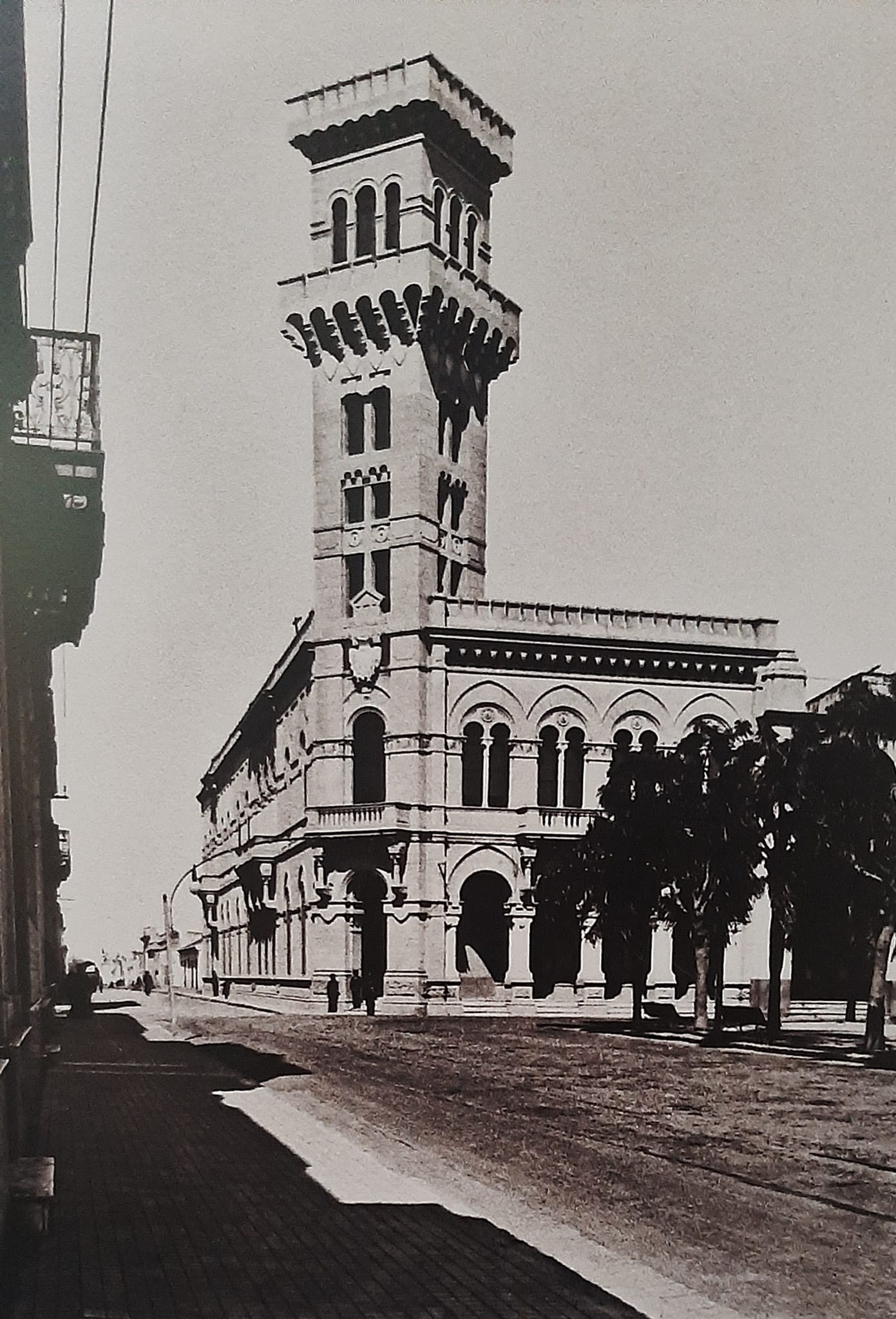 Vista de la calle General López, antes de ser ensanchada y de la demolición de la imponente Casa de Simón de Iriondo, lindante con la Catedral. Nótese las vías del tranvía a eléctrico, rieles que previamente habían sido utilizados por los tranvías a caballo.